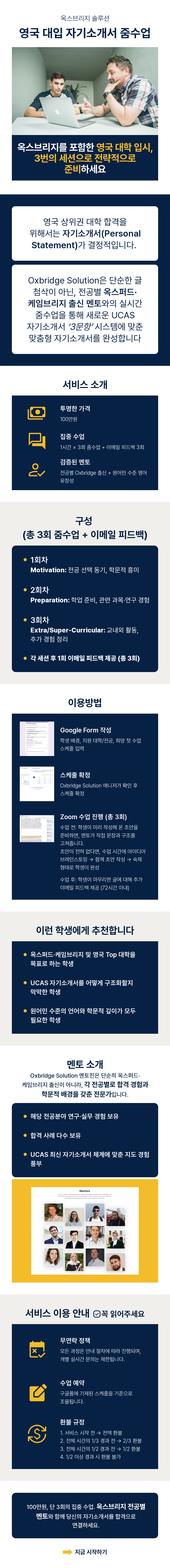 영국 상위권 대학 합격을 위해서는 자기소개서(Personal Statement)가 결정적입니다. Oxbridge Solution은 단순한 글 첨삭이 아닌, 전공별 옥스퍼드·케임브리지 출신 멘토와의 실시간 줌수업을 통해 새로운 UCAS 자기소개서 ‘3문항’ 시스템에 맞춘 맞춤형 자기소개서를 완성합니다.